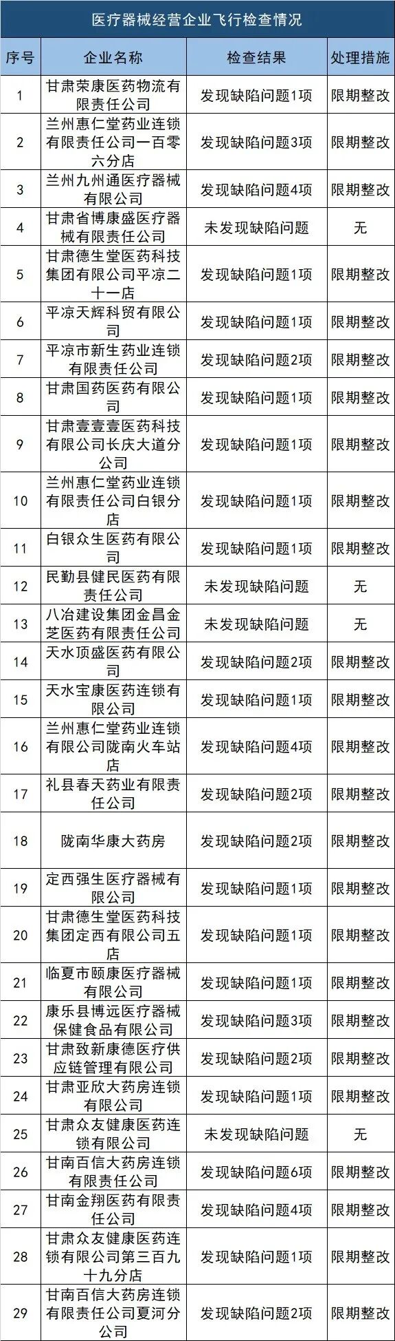 《通告》中,甘肃省药监局对此前11月中下旬组织对省内部分医疗器械经营企业的飞行检查结果进行了公示。