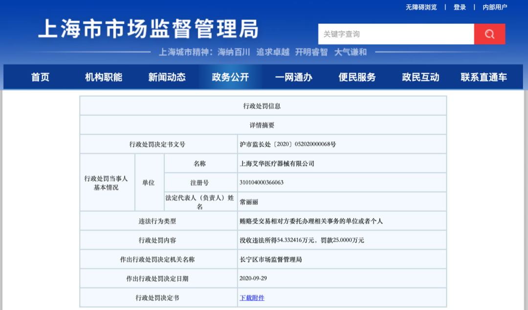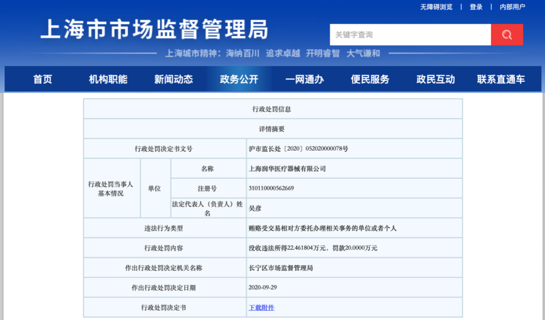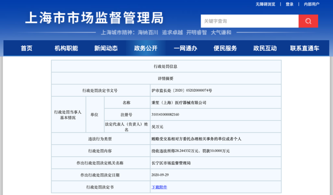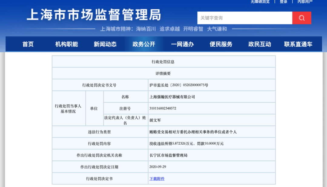 近日,上海市市场监督管理局在同一天发布4条行政处罚通告,4家械企因向医院免费投放设备捆绑耗材销售获利,被罚没近200万!