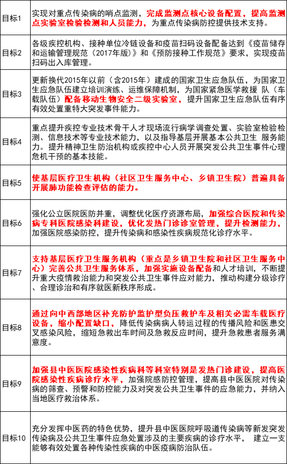 首先,在疾病预防控制体系现代化建设方面,要求实现每省至少有一个达到生物安全三级(P3)水平的实验室,每个地级市至少有一个达到生物安全二级(P2)水平的实验室。
