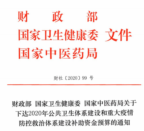 近日,财政部、国家卫生健康委、国家中医药局下发《关于下达2020年公共卫生体系建设和重大疫情防控救治体系建设补助资金预算的通知》(以下简称《通知》)。