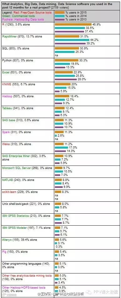 R首次封王,几乎占据半壁江山;Python快速成长中;Excel小幅收缩,守住前五;SAS、SPSS、Matlab传统分析工具有固定用户群,守住自己的阵地;从调查家结果看绝大部分数据科学家使用不止一种数据分析工具。