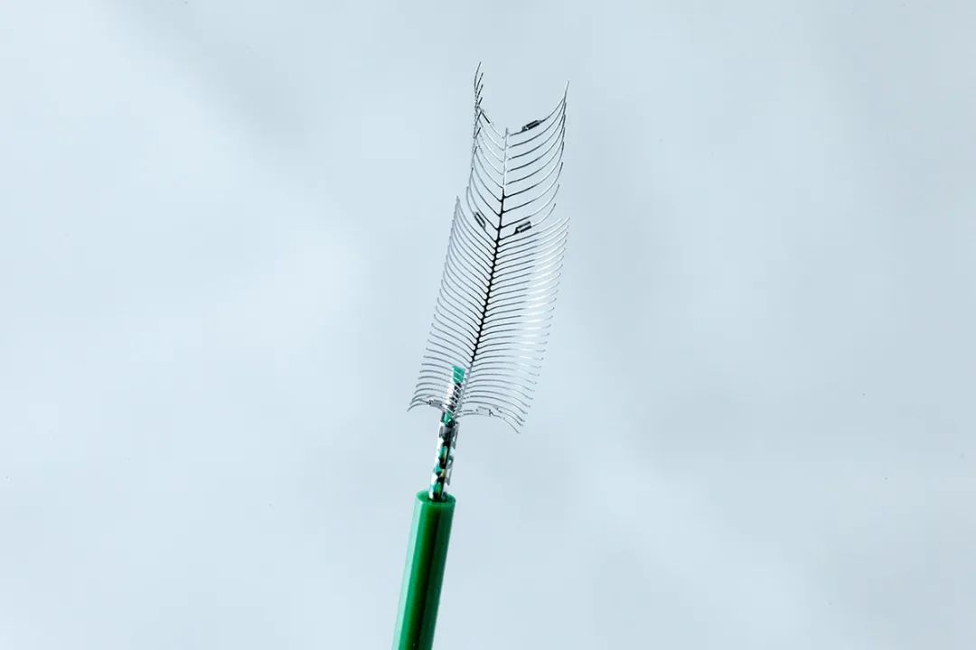 这一类似人体脊肋的结构,能够有效覆盖95%动脉瘤应用,同时包括宽颈分叉病变,支架+血管具备导向作用。两端直接一密一疏,密的一端用来调节血流;疏的一端用来锚定。