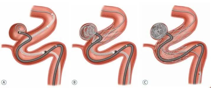 手术需在大腿根部切开一个很小的口子,通过神经介入技术把密网支架植入动脉瘤根部,使动脉瘤腔内的血流速度变慢甚至不流动。再将弹簧圈通过微导管置入并填满动脉瘤腔,达到彻底栓塞动脉瘤效果。