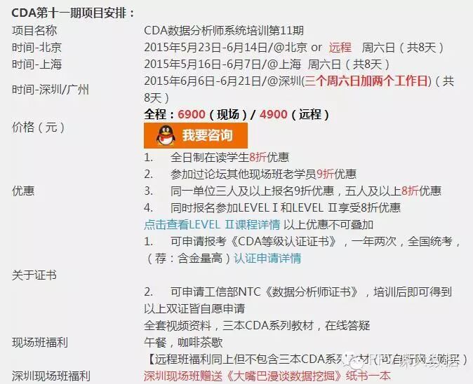 CDA数据分析师系统培训,由人大经济论坛根据CDA协会认证标准而设立的一套针对数据分析师技能的全面系统培训。培训师资目前均来自学界、实务界相关领域的讲师、教授、专家、工程师以及企业资深分析师,名师荟萃,代表了国内数据分析培训的最高水平,可以很好地保证培训的学员既能学到扎实的数据分析理论知识,又能具备较强的利用软件解决实际问题的能力,保证学员能胜任各行业数据分析师工作的要求。CDA数据分析师培训注重结合实际,把最具技术含量、最具价值理念的课程传授给学员。课程还注重启发式教学,让学员在解决问题的动手中去学习。