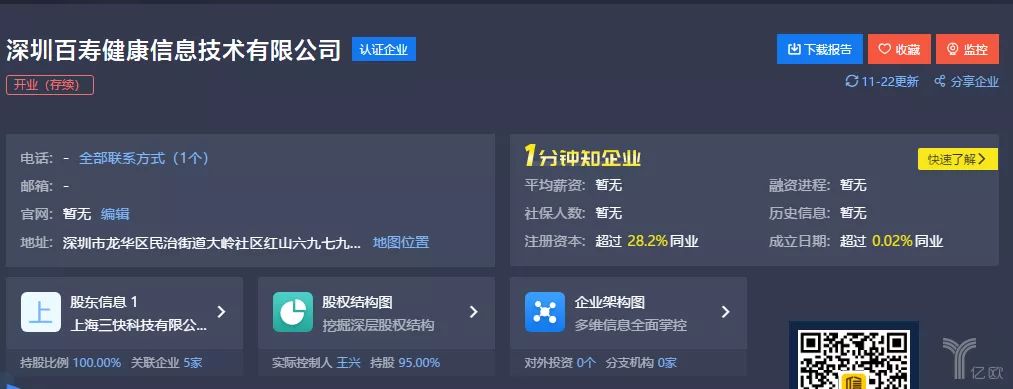 11月22日,由美团CEO王兴持有95%股份的上海三快科技有限公司新增对外投资,成立深圳百寿健康信息技术有限公司,注册资本100万元,经营范围除技术开发、经济贸易咨询外,还包含二类、三类医疗器械的销售。