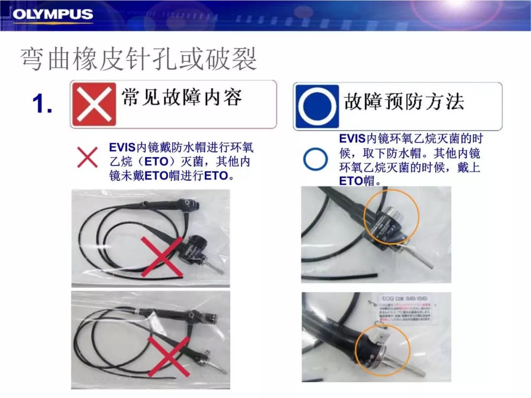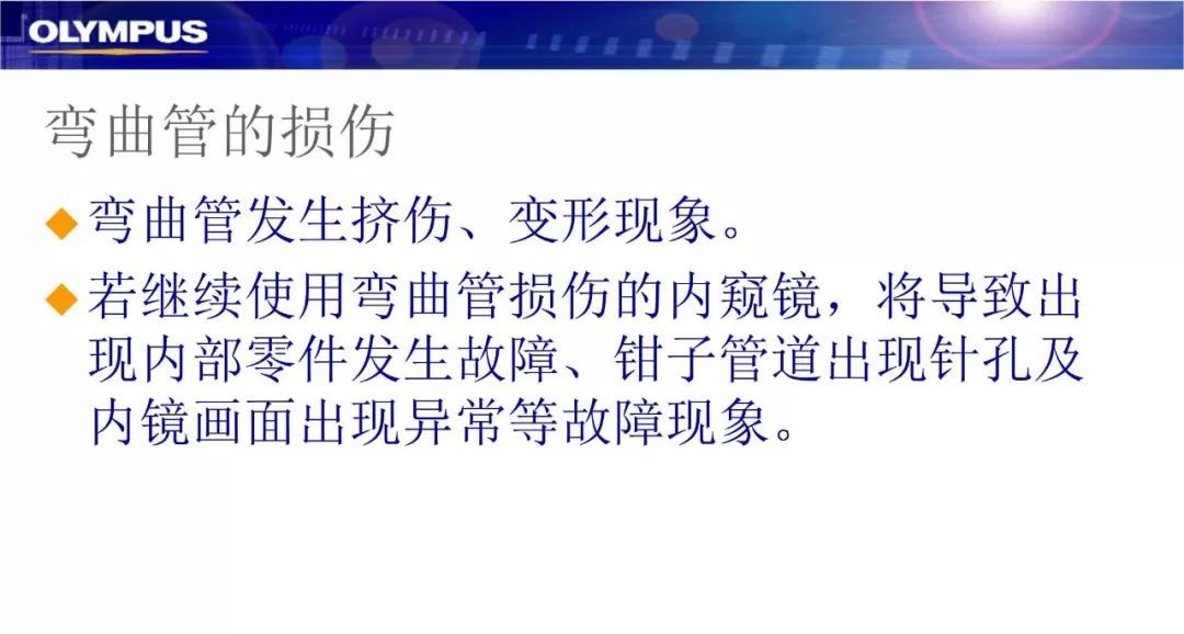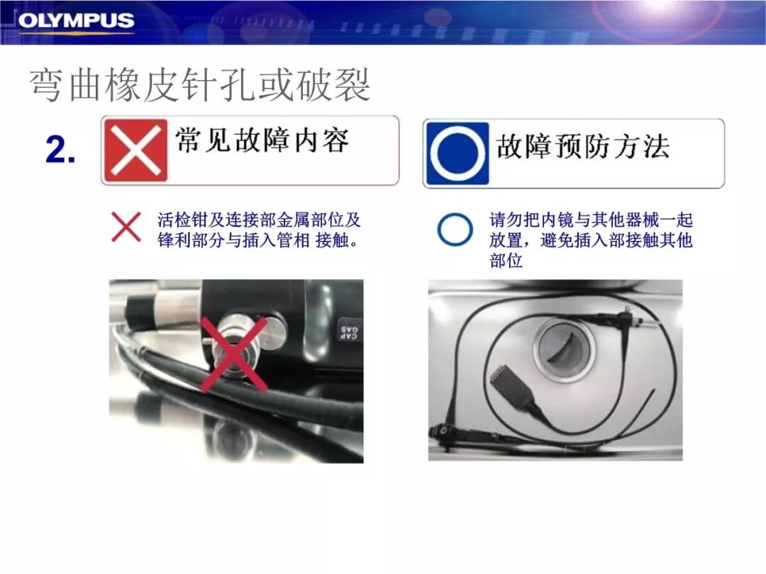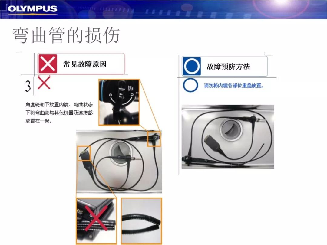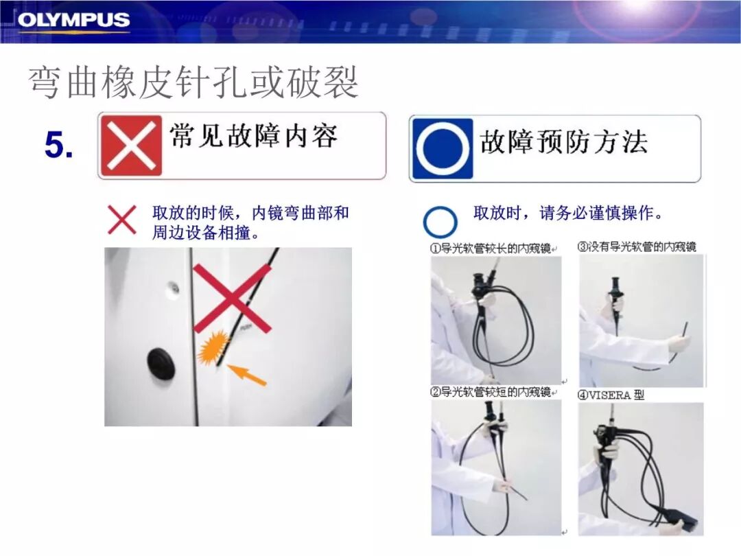 在内镜的使用、运输、清洗及储存过程中,请勿把内镜与其他器械一起放置,避免内镜与其他尖锐物品的接触造成损坏;当电子软镜测漏出现报警、或存在漏水漏气现象后,请停止使用并送修,防止液体在镜子内部对电子元器件腐蚀、造成更大的故障。
