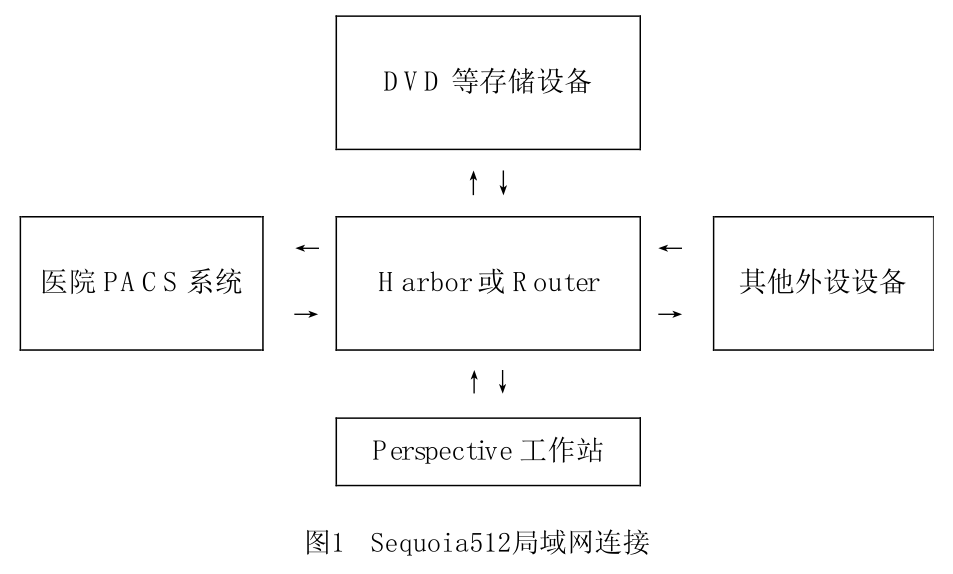 图1即为Sequoia512内部局域网的工作示意图,主机,Per-spective PC后处理工作站、DVD刻录机、PACS通过交换机(Harbor)或路由器(Router)连接,保障影像数据高速实时传输。例如将主机测得的影像按照要求可送至Perspective PC后处理工作站进一步分析,或送至医院PACS系统或送至DVD刻录保存,反之亦然。