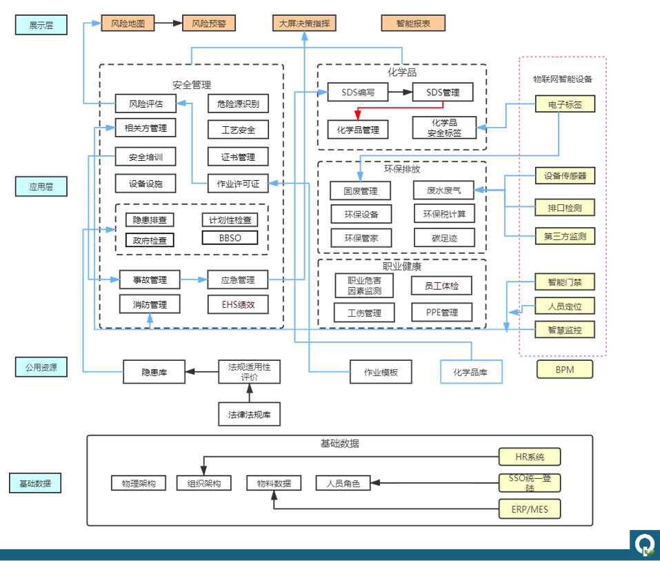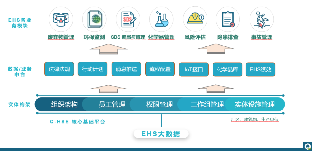 我们匡腾的系统架构,主要分为实体架构、数据/业务中台以及EHS各业务模块三大层级。条理清晰,分级管理,EHS大数据支撑,高效且准确!