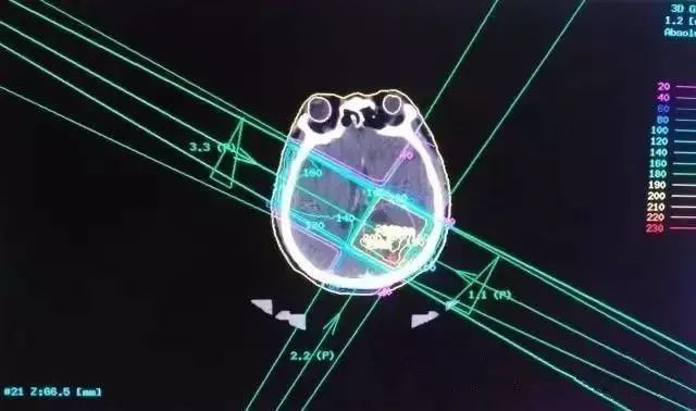 调强放射治疗技术(IMRT)是在三维适形放疗技术上发展起来的,除了完全具备适形放疗的优点外,IMRT技术可实现照射野内的剂量强度调节。这一技术突破不仅能使肿瘤区域(比如临床可见区、亚临床区)实现不同剂量的照射,提高肿瘤的局部控制率,而且可以大限度地减少周围正常组织的剂量,降低正常组织并发症的几率,减少治疗后的副作用。这种技术,治疗过程通常需持续15-20分钟;在治疗过程中,加速器治疗机会根据放疗方案自动围绕患者旋转多个角度,或者重复停止和启动,以从多个不同的角度治疗肿瘤。