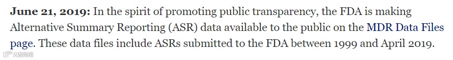 根据上述文件,FDA为了提高公众透明度,正在MAUDE数据库页面上向公众提供替代性总结报告数据,即“隐藏报告”的数据,这些数据文件包括1999年至2019年4月提交给FDA的ASR。