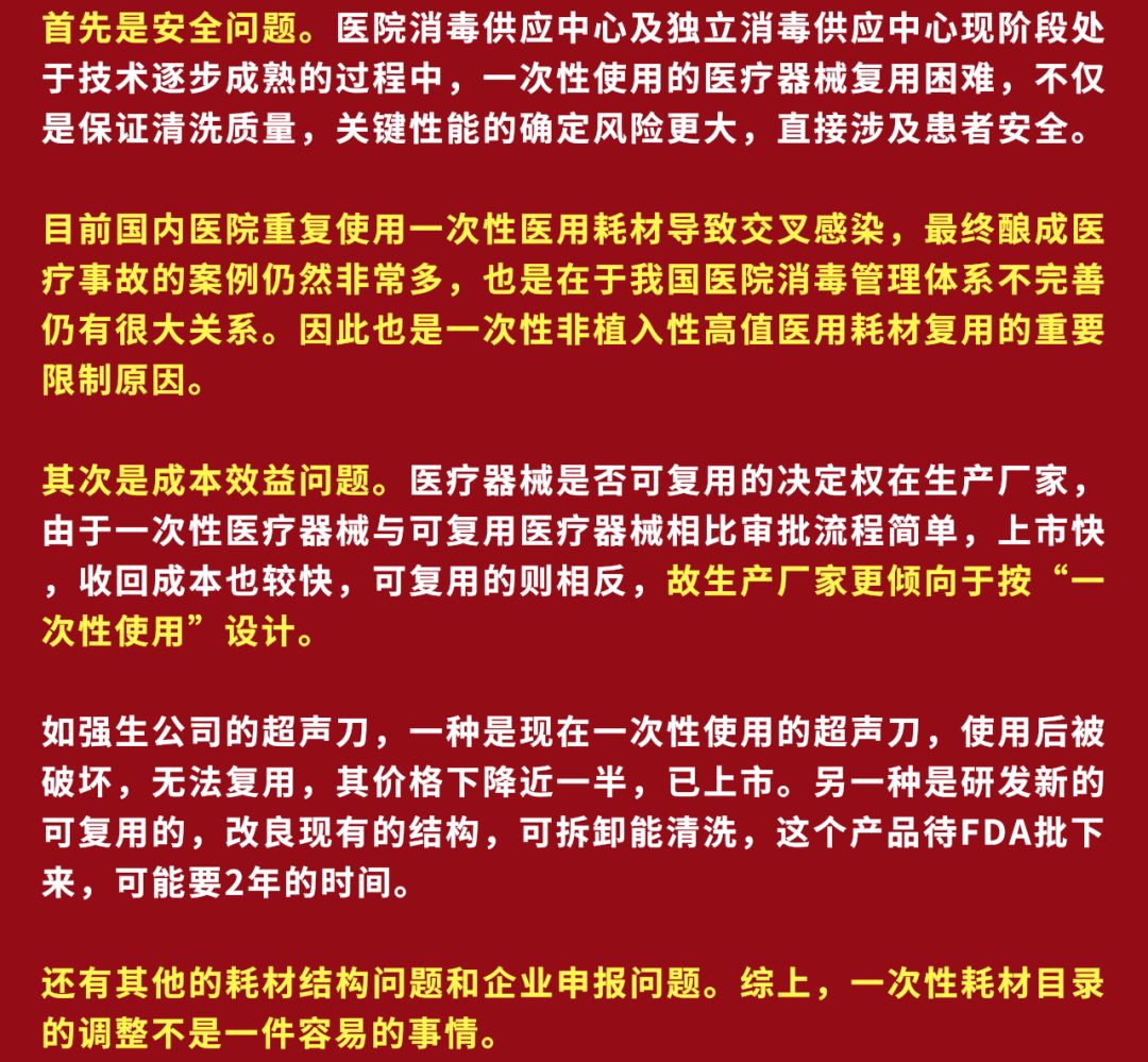 就一次性非植入性高值医用耗材复用,目前争议的焦点就是“一次性高值医用耗材目录的调整”。