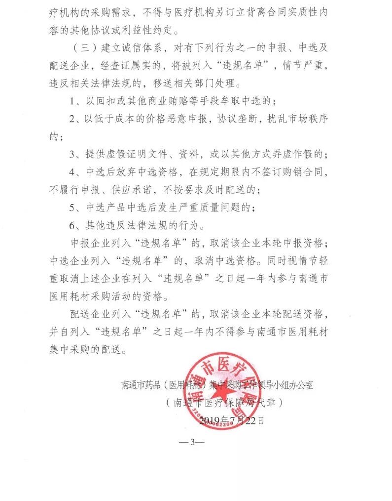此外,南通市建立违规名单以及加强诚信体系,涉贿、恶意竞争、中选后出现严重质量情况等将被列入违规名单,生产经营企业一年内不得参与南通市的耗材招标采购活动。