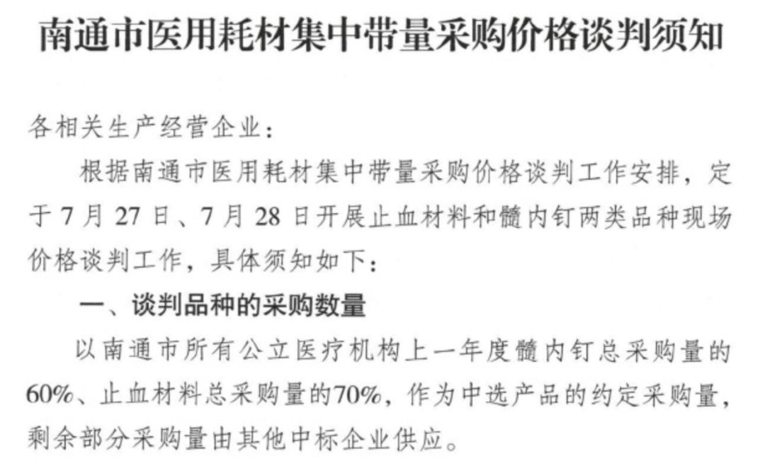 根据南通市的“价格谈判须知”,约定髓内钉的采购量为2018年度全市医院总采购量的60%,止血材料的采购量为2018年度总采购量的70%,剩余部分采购量由其他中标企业供应。