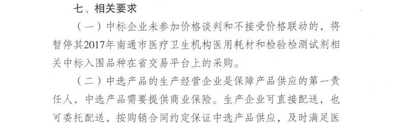 值得一提的是,在基础谈判价格申报阶段,此前南通市的要求是如果过期不申报(截止到7月19日),将暂停其2017年南通市医疗卫生机构医用耗材和检验检测试剂相关中标入围品种在省平台上的采购。