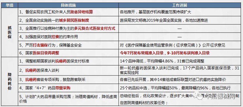 医疗保障局上线后,备受关注。梳理其上线后的工作,虽一手抓医保、一手降药(耗)价,开展了多项令人瞩目的工作(具体工作及进展见下图)。但或许是精力有限,又或许是医用耗材在整个医药领域占比小等原因,尚未真正影响医用耗材领域。