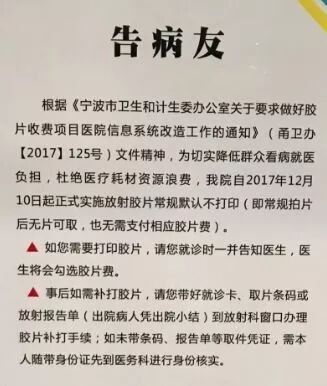 在此之前,浙江省宁波市北仑区人民医就发布一则通知,核心内容就一个:从2017年12月10日开始医用胶片不再默认打印,病人也无需支付相应费用,如果外院会诊或者涉及到第三方赔付需要胶片的自行到相关窗口缴费并补打。