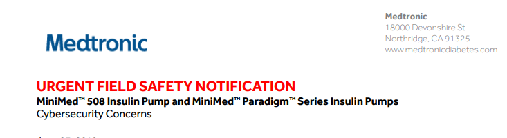 2019年6月27日,美敦力对外发布了一封公开信,信中表示,MiniMed™508胰岛素泵和MiniMed™Paradigm™系列胰岛素泵设计用于使用无线射频(RF)与其他设备(如血糖仪,葡萄糖传感器发射器和CareLink)进行通信™USB设备。
