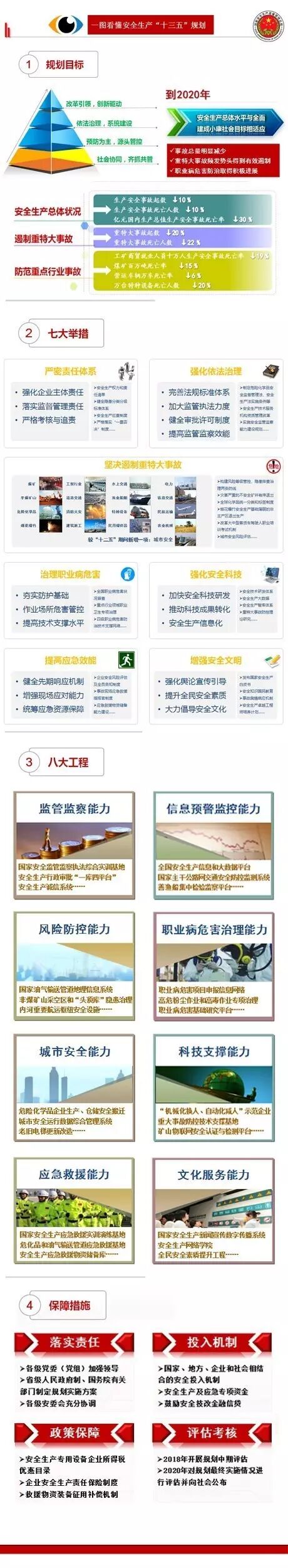 《规划》强调大力提升整体安全生产水平,有效防范遏制各类事故,为全面建成小康社会创造良好稳定的安全生产环境,提出到2020年事故总量明显减少,重特大事故频发势头得到有效遏制,职业病危害防治取得积极进展,安全生产总体水平与全面建成小康社会目标相适应的总体目标,以及亿元国内生产总值生产安全事故死亡率、工矿商贸就业人员十万人生产安全事故死亡率等9项具体指标。