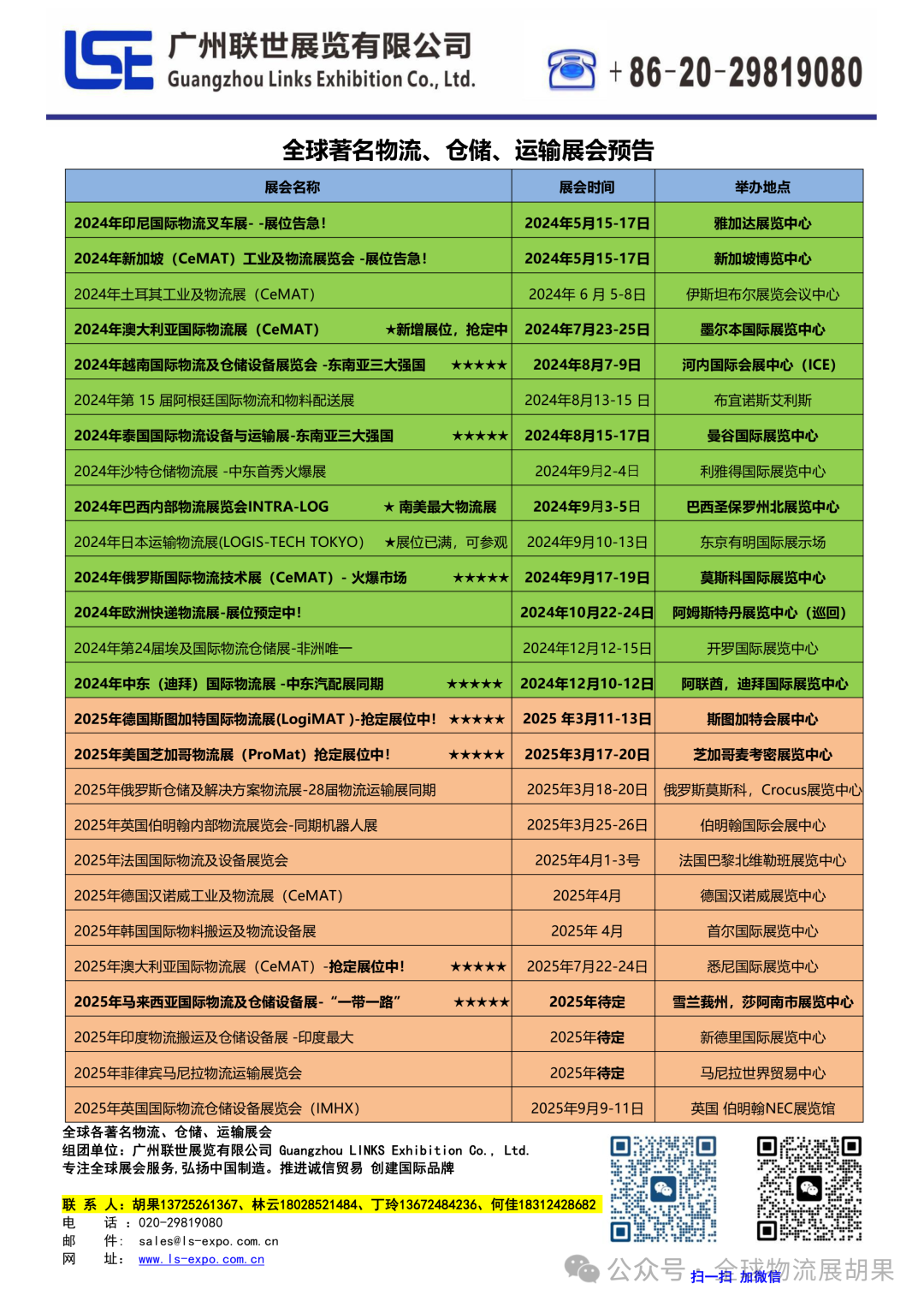 广州联世展览是一家专业的展览公司,有着丰富的海外组展经验。我司做为国内唯一一家专业代理全球物流展的组团机构,跟国外20多个国家主办方都建立了良好的合作关系,为国内90%的生产出口企业提供了国外物流展会的信息,已跟世界各国物流展主办建立了良好的合作关系。