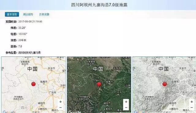 2017年08月08日21时19分46秒在四川阿坝州九寨沟县发生7.0级地震,震中距九寨沟县39公里、距松潘县66公里、距舟曲县83公里、距文县85公里、距若尔盖县90公里,距陇南市105公里,距成都市285公里。