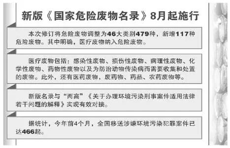 环保部有关负责人对记者表示,《国家危险废物名录》(2016版)的发布实施将推动危险废物科学化和精细化管理,对防范危险废物环境风险、改善生态环境质量将起到重要作用。