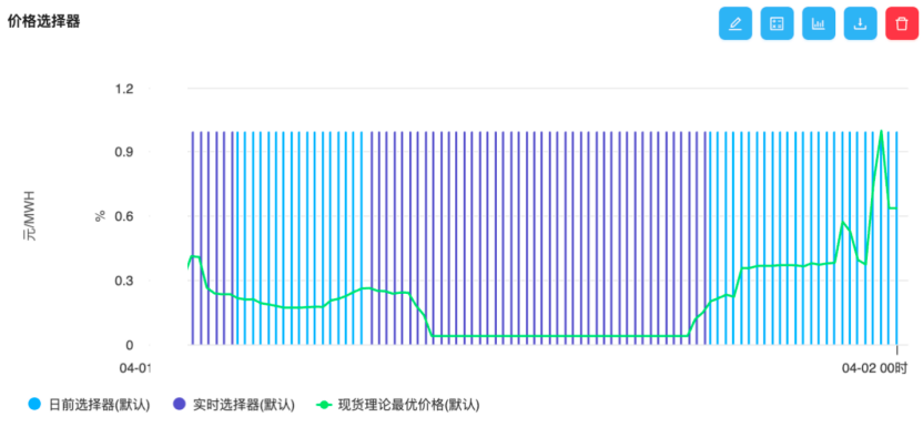 如果我们能够完全准确地预测新能源总出力,那么我们也就等效于提前得到实际的竞价空间。那么,基于我们的“竞价空间差”理论,我们就可以相对比较准确地在日前和实时现货价格之间做出选择。具体来说,当基于省调的“日前竞价空间”大于理想第三方的“实际竞价空间”,那么我们就认为日前价格会较高,而反之亦然。基于这样的操作原则,我们可以得到如下图所示的价格选择策略(以4月1日为例),以及对应的策略价格曲线(绿)。