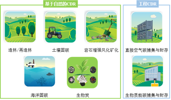 工程CDR是指基于工程技术方法从大气中捕集CO₂,并将其分离后用于商业用途或地质封存,包括生物质能碳捕集与封存(BECCS)和直接空气碳捕集与封存(DACCS)。