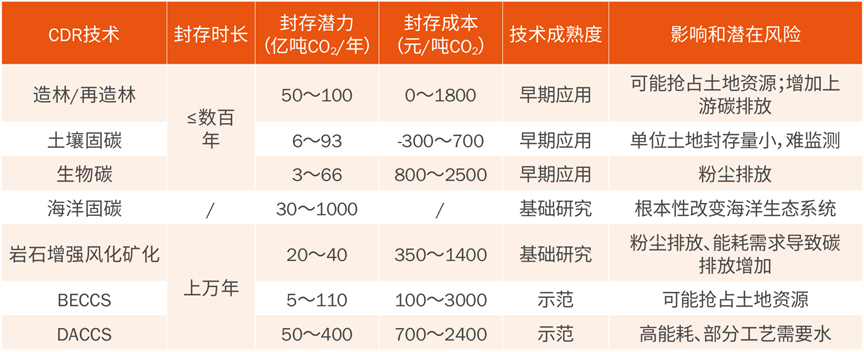 目前,基于自然的CDR是最具成本效益和可扩展性的技术选择,全球造林/再造林等基于自然的CDR已经有一定规模的应用。但是,由于气候变化和人类干预等原因,基于自然的CDR有其局限性,例如移除持久性有限,封存稳定性难以确定,且封存能力会逐渐饱和。