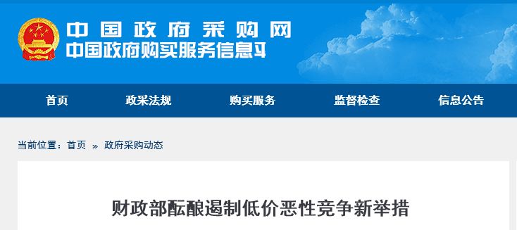 近日,中国政府采购网发布最新通告《财政部酝酿遏制低价恶性竞争新举措》。