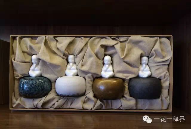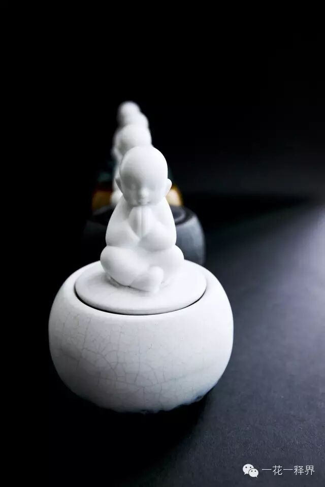 罐上的小沙弥是由台湾老师傅手工精心雕琢,在柴窑选用高山红泥与罐盖一体烧制而成,密封部分由棉麻为原材料制成的无纺布组成,密封性极佳。罐上小沙弥各个神态安详、虔诚的禅坐,感受一种平和与爱。