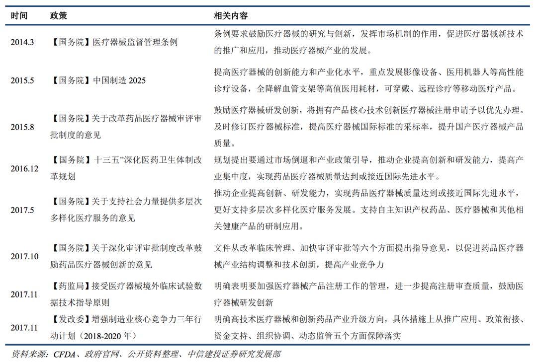 另外,《“十三五”医疗器械科技创新专项规划 》以及《高端医疗器械关键技术产业化实施方案》的接连出台,旨在依托创新能力强、规模效应明显、具有国际视野的行业企业提升科技创新能力。