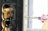 换上锁芯后再把锁芯螺丝扭紧再安装上内外拉手在房内的拉手上有两个螺丝眼,