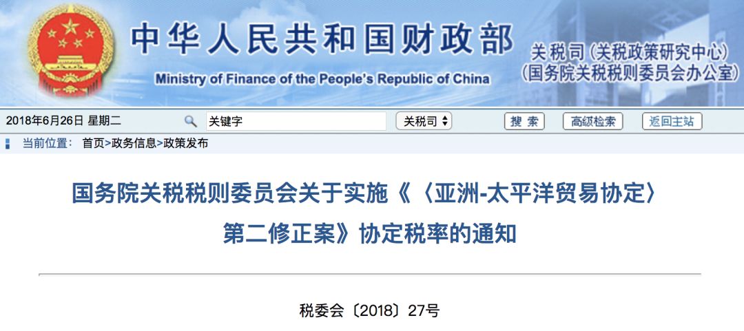 最新,国务院关税税则委员会发布通知,决定自2018年7月1日起,对原产于孟加拉国、印度、老挝、韩国、斯里兰卡的进口货物适用《〈亚洲-太平洋贸易协定〉第二修正案》协定税率。