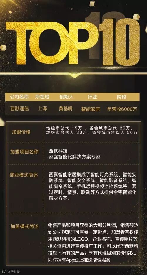 据投资专家分析,入选该榜单的创业品牌都具备完善的商业模式,创始人为来自一线城市互联网创业者,企业发展模式也已趋近成熟。二、三线城市中小创业者加盟后,在短期内就能共享互联网时代创业红利!