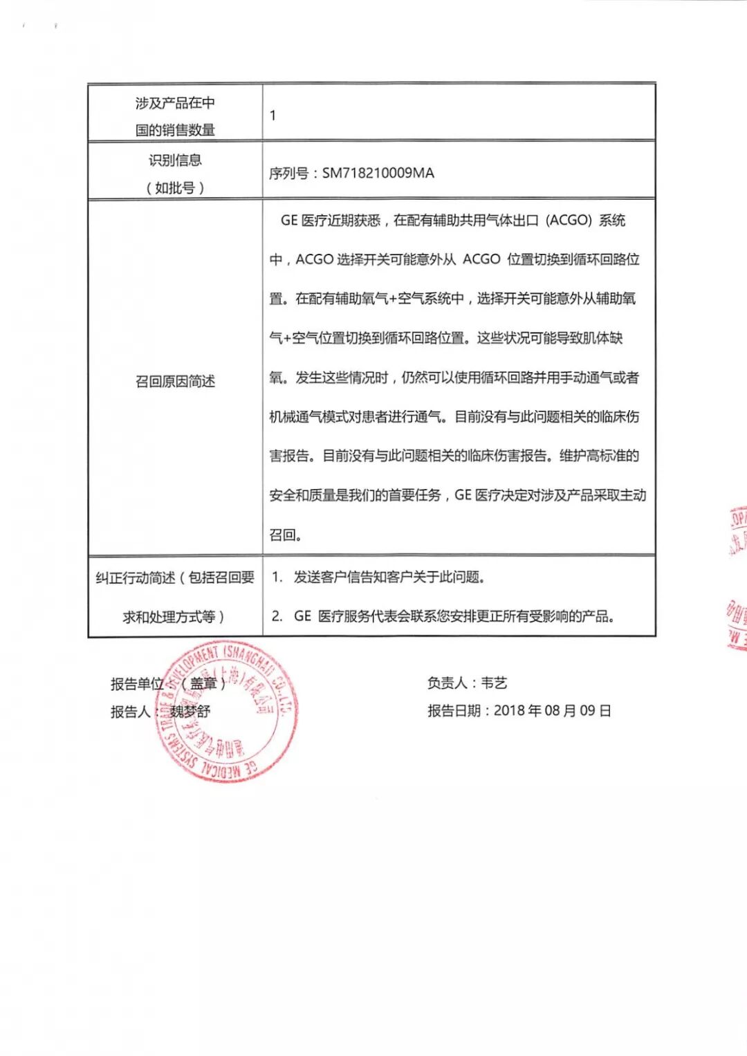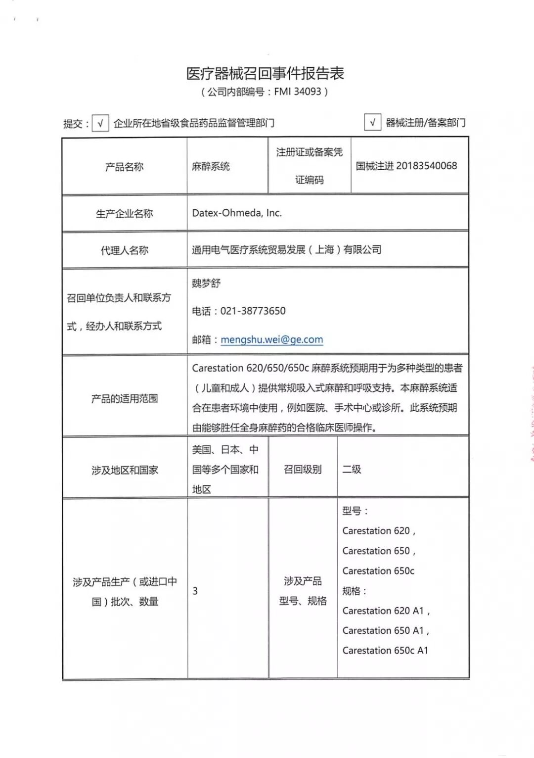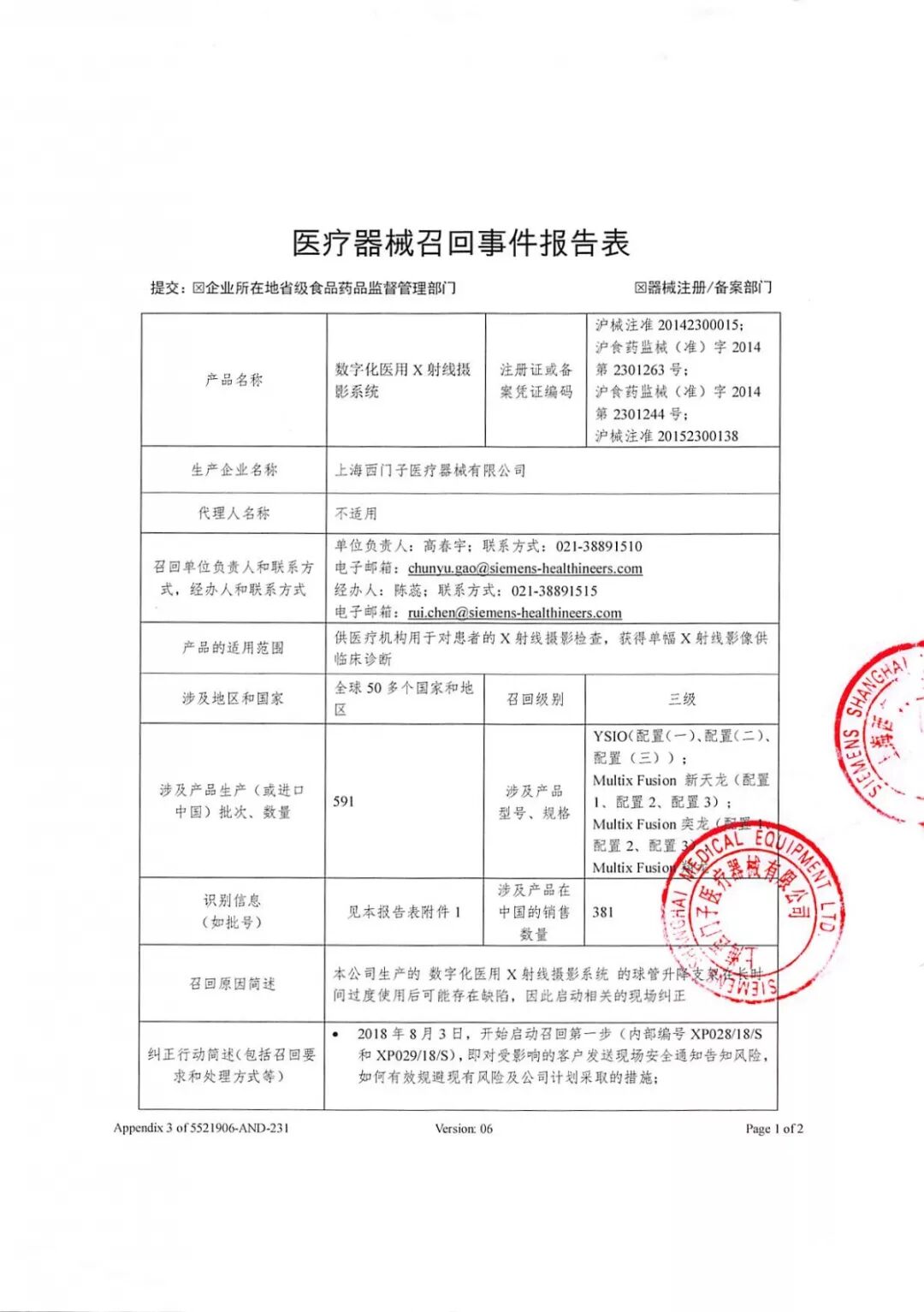 上海西门子医疗器械有限公司,本次因产品的球管升降支架在长时间过度使用后可能存在缺陷,发布公告召回国内售出的381台数字化医用X射线摄像系统。