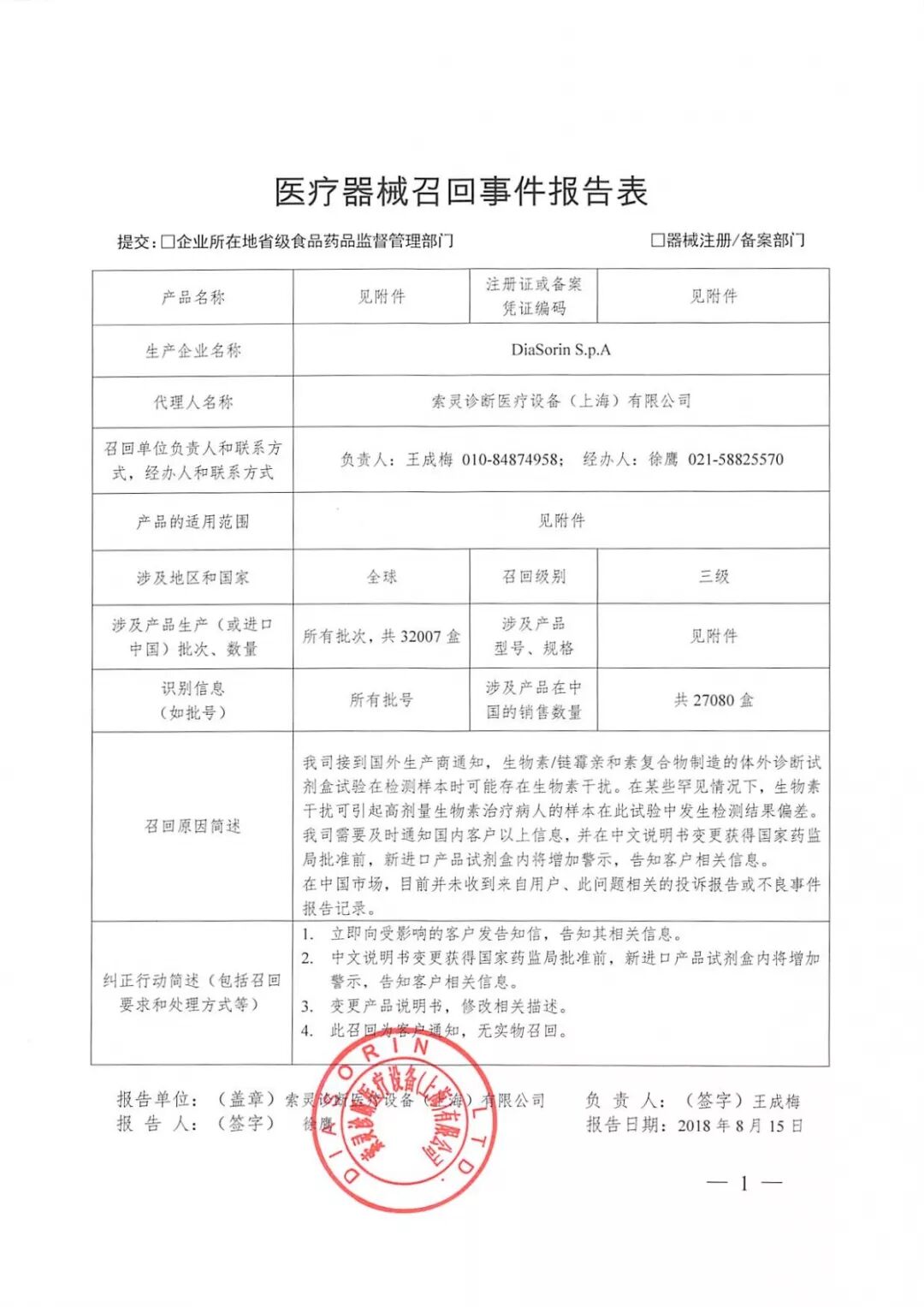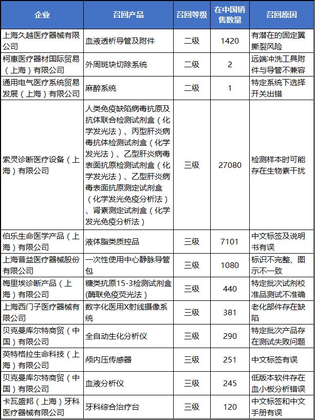 其中,召回数量最大的是索灵诊断医疗设备(上海)有限公司生产的试剂盒,国内销售数量竟然高达27080盒!召回的主要原因是该批试剂盒在检测样本时可能存在生物素干扰。