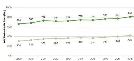 与药物市场相比,2017年全球处方药市场规模7770亿美金,到2022年,将达到1.043万亿美金,CAGR年化增长5.2%。2022年,器械市场约占到全球药物市场规模的一半,两个市场的增速相当。