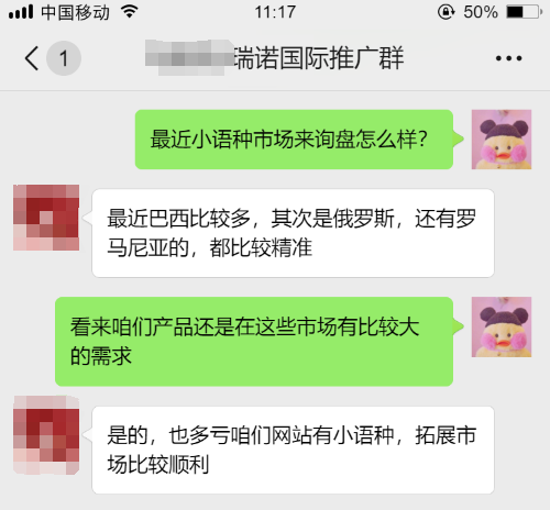 下图来自瑞诺国际与客户的一个对接沟通群。根据客户反馈,有从巴西、俄罗斯、罗马尼亚等小语种国家来的询盘,而且比较精准。