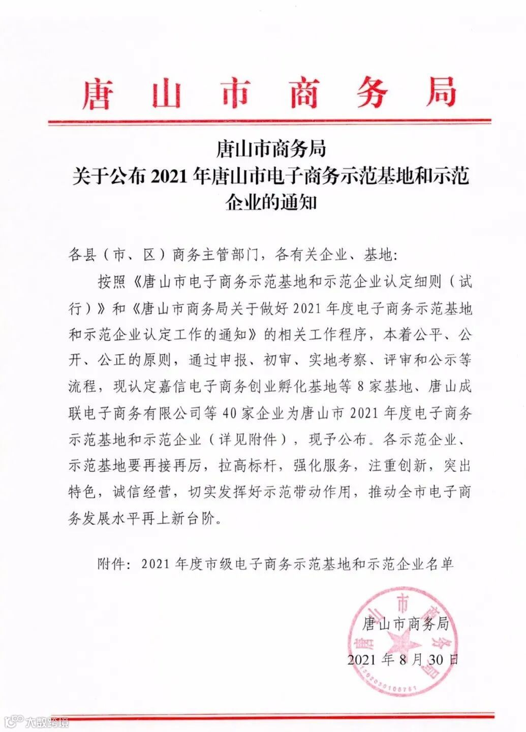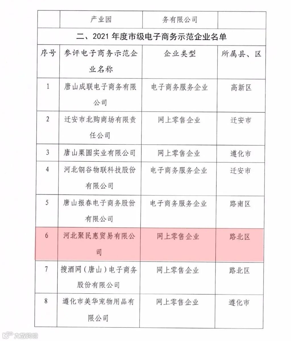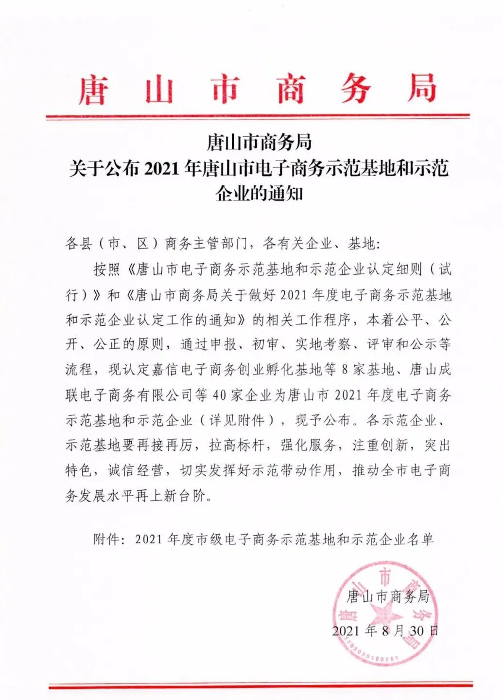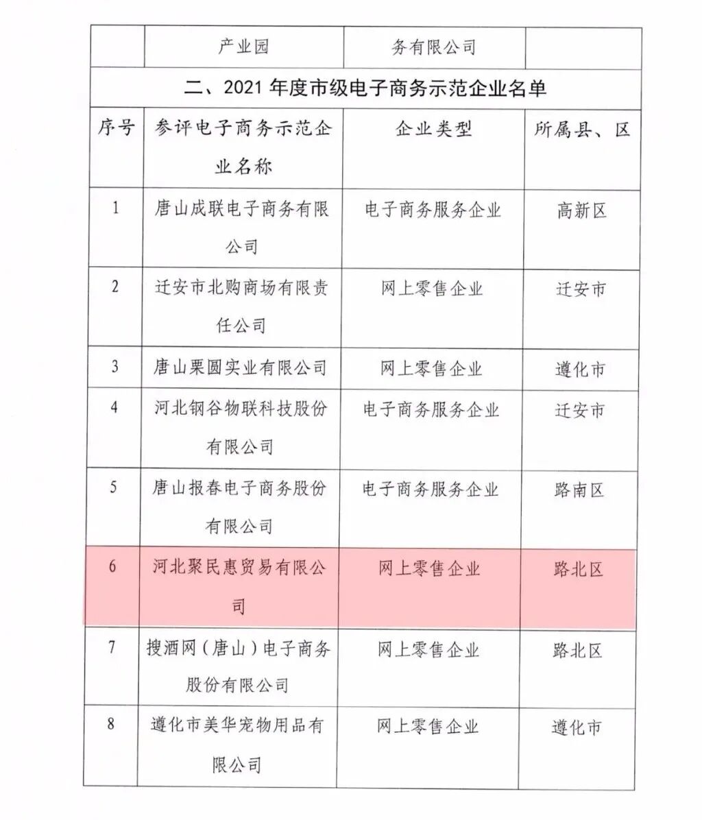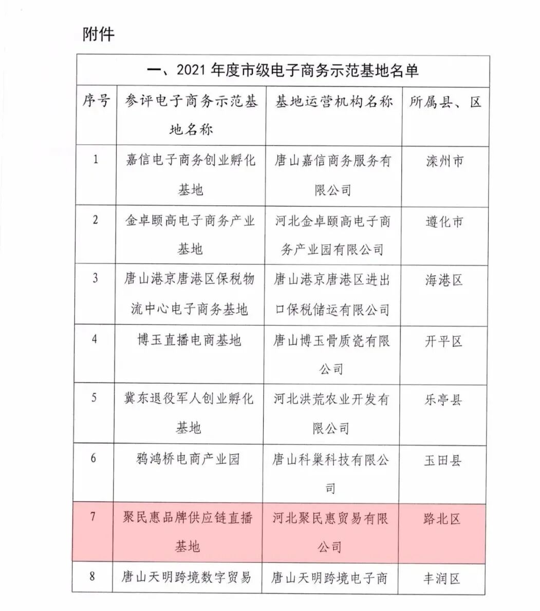 近日,聚民惠通过电子商务主管部门一系列的申报、初审、实地考察、评审和公示等严格审核流程后,荣获 “唐山市电子商务示范企业”称号,聚民惠品牌供应链直播基地荣获“唐山市电子商务示范基地”双项荣誉称号。本次双项荣誉的获得不仅是对聚民惠电商模式的支持和肯定,也为聚民惠今后在电商领域持续发展,提供了强大动力和信心。