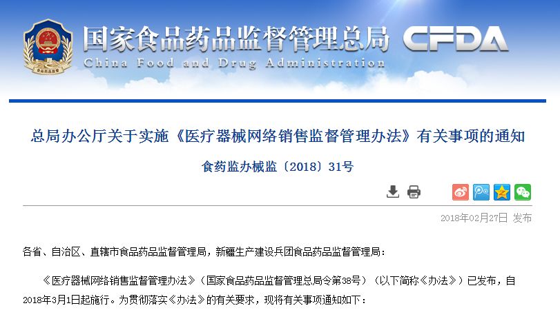2月27日,国家食品药品监督管理总局发布总局办公厅关于实施《医疗器械网络销售监督管理办法》有关事项的通知(以下简称《通知》)。《通知》做了三点要求:
