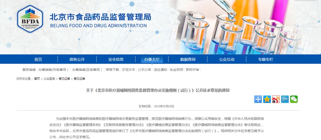 此前,北京市食品药品监督管理局就《北京市医疗器械网络销售监督管理办法实施细则(试行)》公开征求意见。