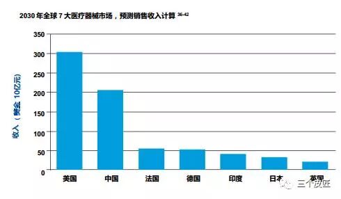 美国在2030年将继续主导医疗器械行业,销售将超过美金3,000亿元,但前五大市场还将包括中国(排名第二位, 占全球市场份额超过25%,收入将超过美金2,000亿元32)和印度(排名第五, 收入将超过400亿美元33)。受医疗改革、地方政府的激励措施和对医疗的总体需求增长的推动3435,中国和印度的增长速度已经是整体市场的两倍。这两个国家也在快速地发展成为创新中心——印度已经被誉为廉价工程技术的全球中心, 制造了许多具有全球市场潜力的本土(和低成本)器械。