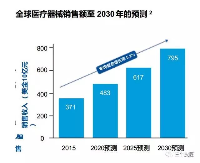 医疗器械行业有望保持稳定增长,全球年度销售额预测以每年超过5%的速度增长,到2030年销售额将达到近8000亿美元1。 这些预测反映了人们随着现代生活习惯病日益普遍,对创新型新设备(如可穿戴设备)和服务(如健康数据)的需求持续增长,以及新兴市场(尤其是中国和印度市场)的经济发展释放了的巨大潜能。