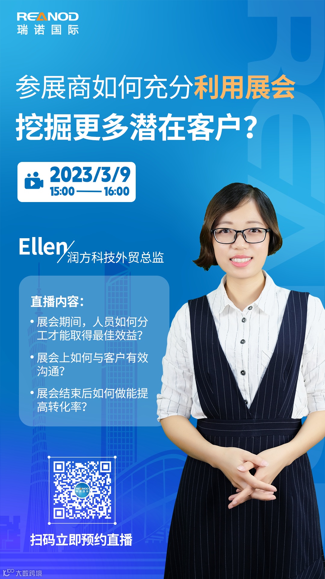此次直播依然由润方科技的外贸总监Ellen主讲,主题:《参展商如何充分利用展会,挖掘更多潜在客户》,她将为大家分享多年来她在展会中积累的经验和技巧,帮助参展商更好地掌握参展的诀窍。如果你想要了解更多有关参展的技巧和方法,以及如何在展会中取得更好的效果,那么这场直播绝不能错过!