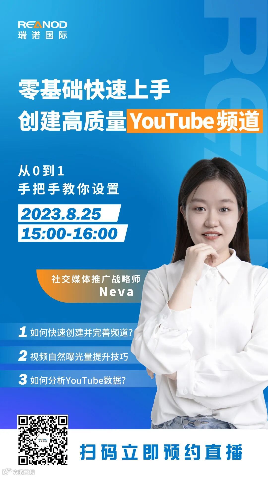 为了帮助大家快速上手,瑞诺国际将在8月25日下午15:00举办一场YouTube频道创建实操课直播。