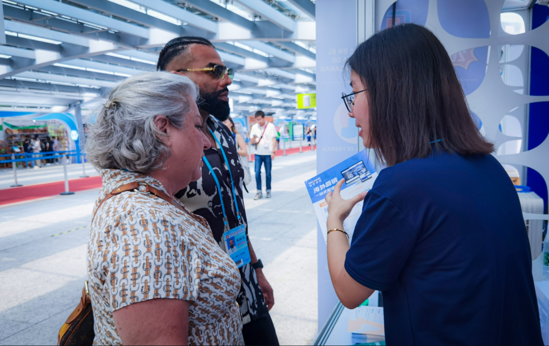 广交会现场,外商拉着行李箱穿梭在展位之间,看产品,与企业代表沟通;外贸企业代表一面为客户讲解产品,一面打开网站进行展示,在有限时间让外商了解更多公司和产品信息,解决外商需求,达成订单合作。