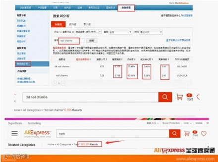 从图中搜索词分析中,可看出大词nails的转化率1%,产品是969264个,而3D nail charms转化率是2.43%,产品数是6900。虽然搜索nails客户更多,但是竞争激烈,没有任何销量情况下,产品不一定有好的曝光。但 3D nail charms,转化率高,优化这个词排名相对容易。