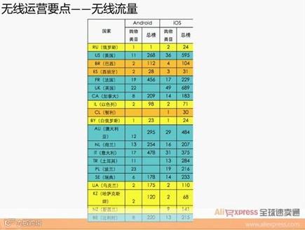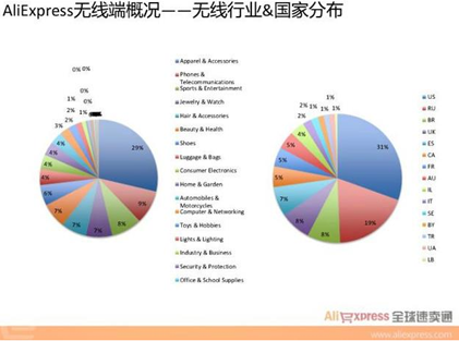 行业分布跟AliExpress主站差别不大,主要还是服饰、数码和运动等等。而无线端的成交按国家分布来看,与主站存在一定差异,无线端成交金额最高的国家是美国,且占到无线端总成交的30%以上,其次才是俄罗斯、巴西等国家。