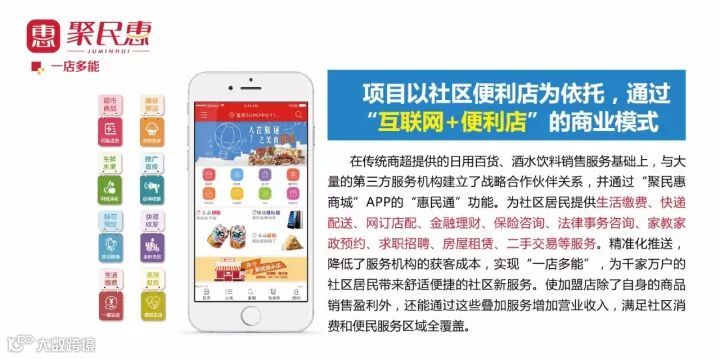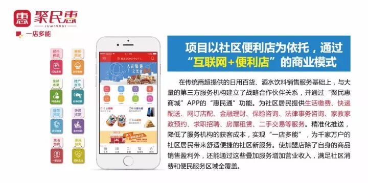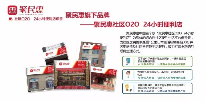 集团旗下品牌“社区O2O 24小时便利店”项目,采用“互联网+便利店”的商业模式,在传统商超提供的日用百货、酒水饮料销售服务基础上,进行软硬件的改造升级和服务体系的植入,以社区便利店为服务载体,通过聚民惠自主研发的聚民惠订货APP、聚民惠APP,利用惠到家、惠民通等功能,为社区居民提供最后一公里日常生活所需30分钟闪电送货到家以及社区全方位生活服务,实现一店多能。成功构建了信息智能、服务便捷、管理精细、环境宜居的智慧社区,为千家万户的社区居民带来舒适便捷的社区新服务。