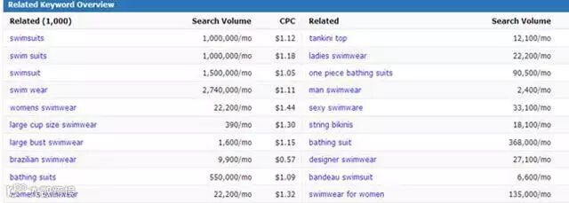 搜索量最大的几个关键词是泳装的主关键词,如Swimwear,Swim wear,Swimsuit,Bathing Suit等,而其他关键词可以作为长尾关键词。这些关键词用于产品搜索、产品信息加工中的命名及描述中,会大大提升SEO的优化水平。